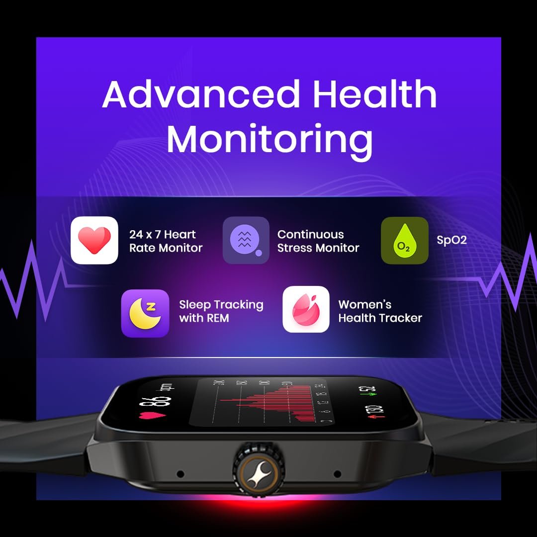 NitroFast Charging, AI Voice Asistance, Advanced 100+ Cloud Watchfaces, Multisport, Up to 5 day battery, IP68 Water Resistance and many more handy features at a single tap; Health Monitoring with Stress monitor, 24×7 HRM, SPO2 ,Women’s Health