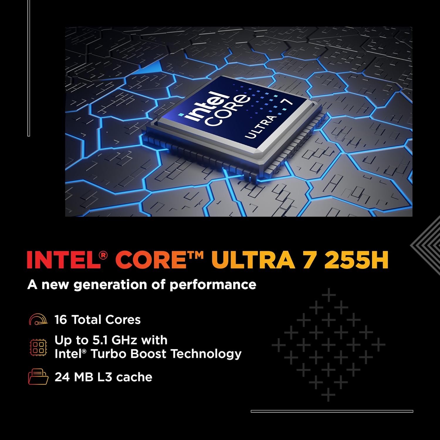 Processor, Memory & Storage: Intel Core Ultra 7 255H (up to 5.1 GHz with Intel Turbo Boost Technology, 24 MB L3 cache, 16 cores, 16 threads)| Memory: 24 GB DDR5-5600 MT/s (1 x 24 GB) | Storage: 1 TB PCIe Gen4 NVMe M.2 SSD