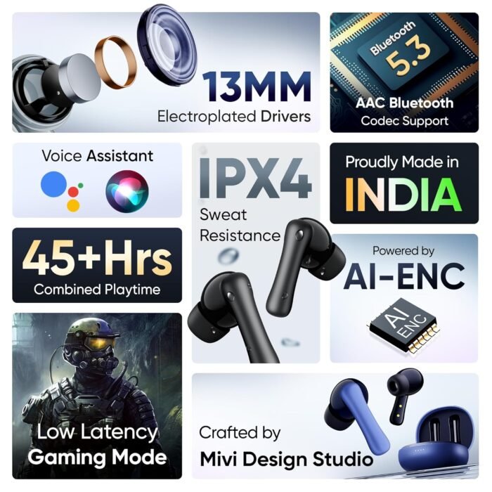 ✅Sound and Design: MIVI DuoPods i2 TWS have been engineered to perform and crafted to impress. The Matt dual-tone finish on the buds offers a sleek look and superior sound quality making it for the best of both worlds.