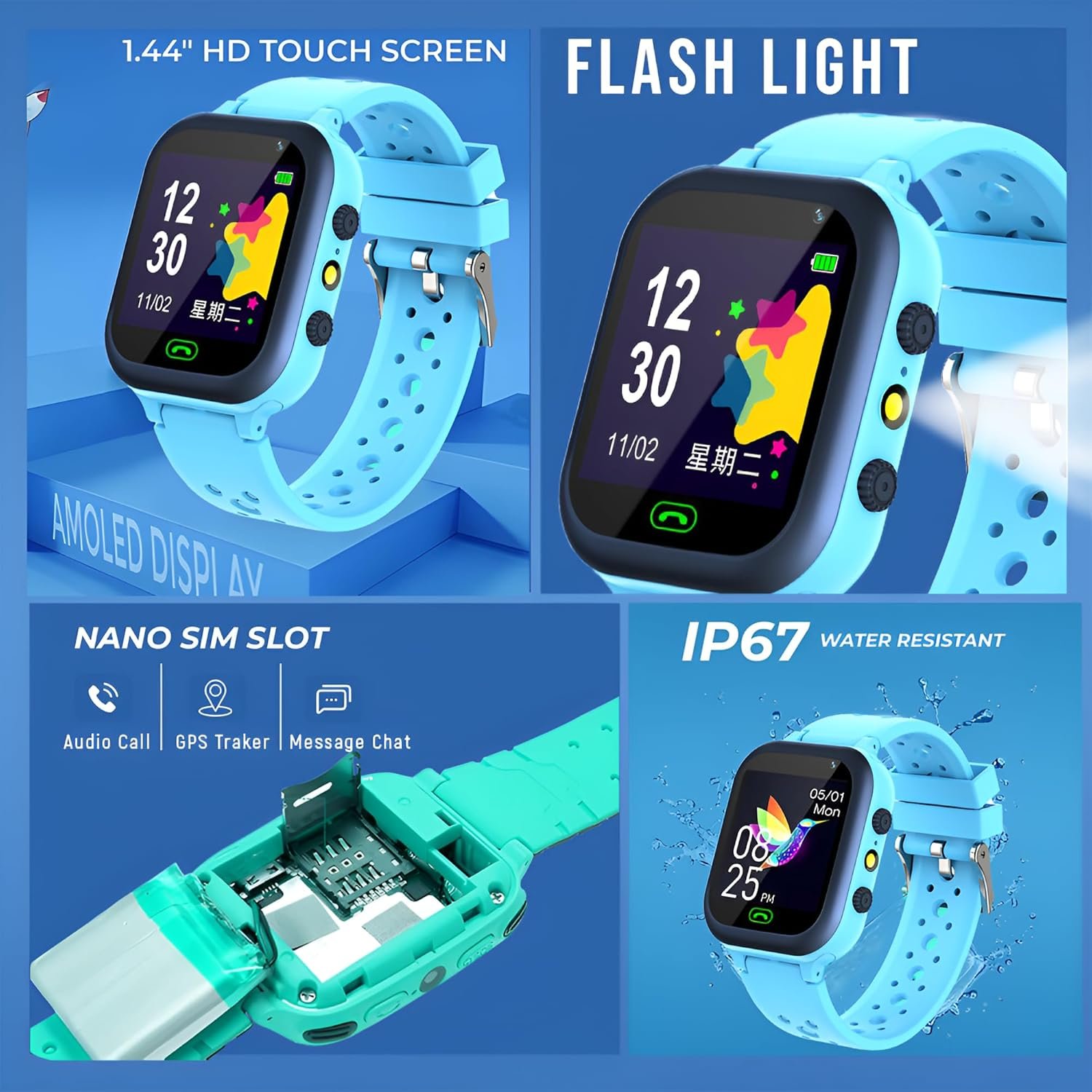 【Muti-Functional Smart Watch for Kids】Kids smartwatch with selfie-cam, games, torch, MP3 player, voice recorder, pedometer, alarm, stopwatch, theme, screensaver select, backlight time, silent profile, five country language, ringtone volume etc.